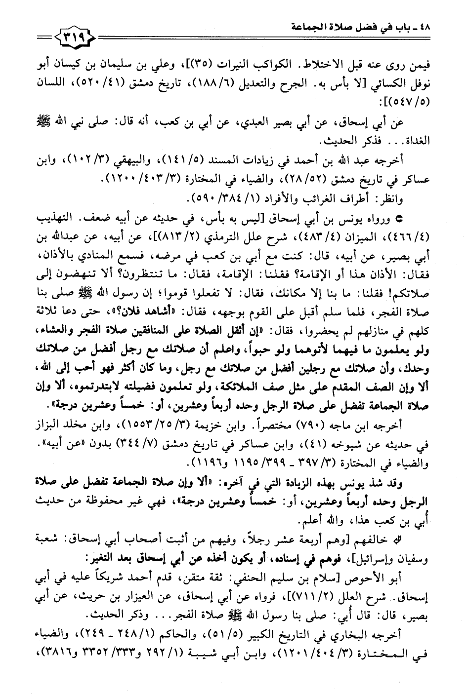 • ورواه يونس بن أبي إسحاق [ليس به بأس، في حديثه عن أبيه ضعف. التهذيب (٤/ ٤٦٦)، الميزان (٤/ ٤٨٣)، شرح علل الترمذي (٢/ ٨١٣)]، عن أبيه، عن عبد الله بن أبي بصير، عن أبيه، قال: كنت مع أبي بن كعب في مرضه، فسمع المنادي بالأذان، فقال: الأذان هذا أو الإقامة؟ فقلنا: الإقامة، فقال: ما تنتظرون؟ ألا تنهضون إلى صلاتكم! فقلنا: ما بنا إلا مكانك، فقال: لا تفعلوا قوموا؛ إن رسول الله - صلى الله عليه وسلم - صلى بنا صلاة الفجر، فلما سلم أقبل على القوم بوجهه، فقال: "أشاهد فلان؟ "، حتى دعا ثلاثة كلهم في منازلهم لم يحضروا، فقال: "إن أثقل الصلاة على المنافقين صلاة الفجر والعشاء، ولو يعلمون ما فيهما لأتوهما ولو حبوًا، واعلم أن صلاتك مع رجل أفضل من صلاتك وحدك، وأن صلاتك مع رجلين أفضل من صلاتك مع رجل، وما كان أكثر فهو أحب إلى الله، ألا وإن الصف المقدم على مثل صف الملائكة، ولو تعلمون فضيلته لابتدرتموه، ألا وإن صلاة الجماعة تفضل على صلاة الرجل وحده أربعًا وعشرين، أو: خمسًا وعشرين درجة".