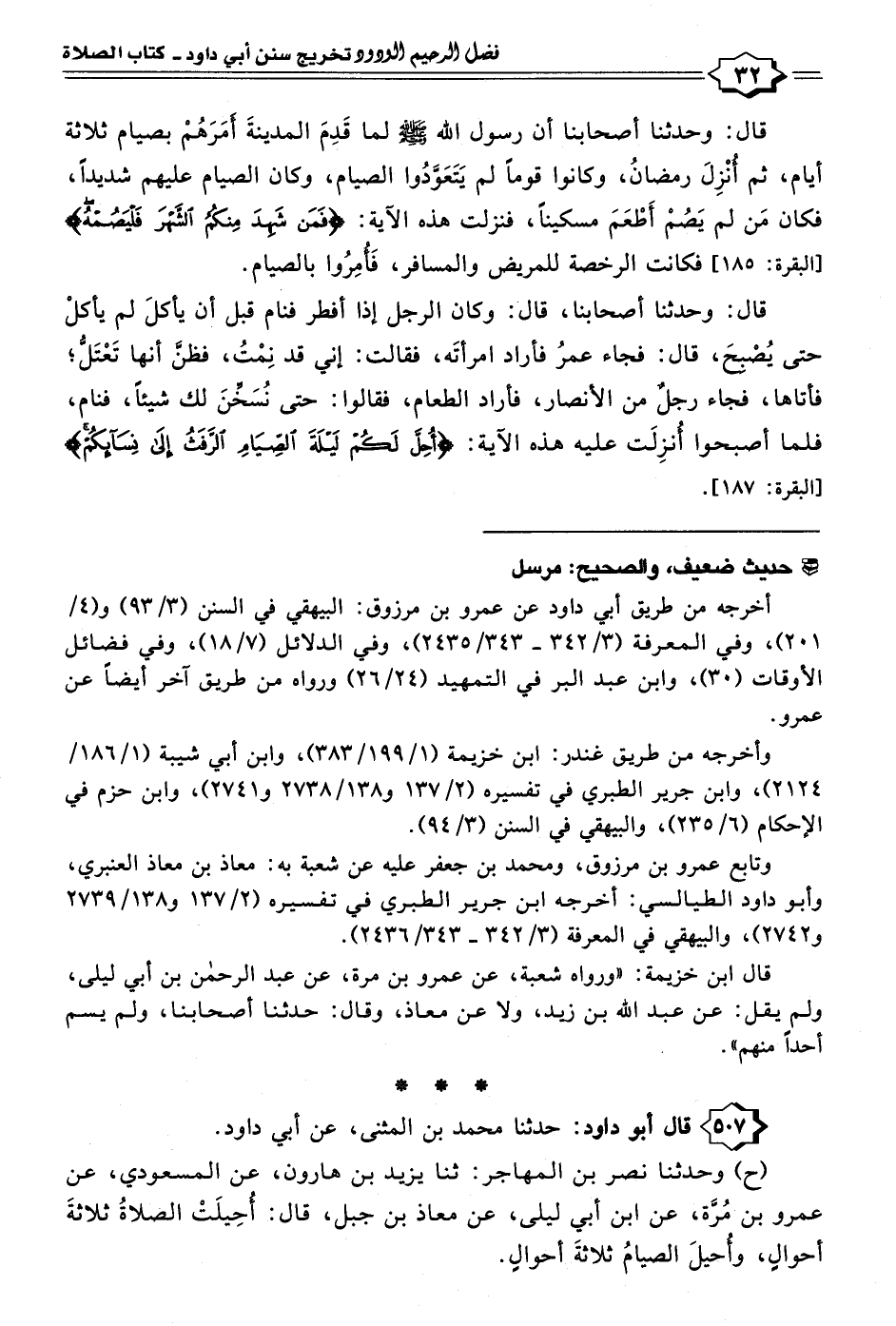 (ح) وحدثنا نصر بن المهاجر: ثنا يزيد بن هارون، عن المسعودي، عن عمرو بن مُرَّة، عن ابن أبي ليلي، عن معاذ بن جبل، قال: أُحِيلَتْ الصلاةُ ثلاثةَ أحوالٍ، وأُحيلَ الصيامُ ثلاثةَ أحوالٍ.