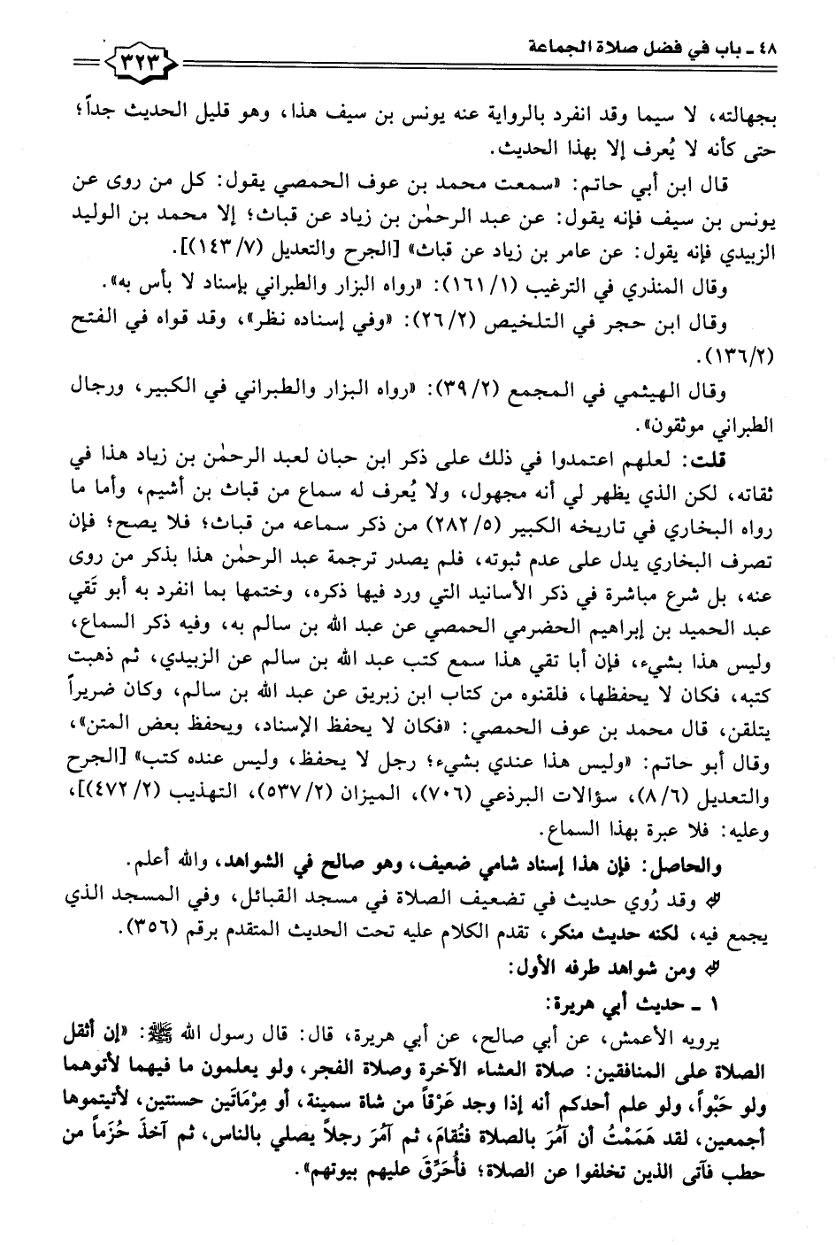 يرويه الأعمش، عن أبي صالح، عن أبي هريرة، قال: قال رسول الله - صلى الله عليه وسلم -: "إن أثقل الصلاة على المنافقين: صلاة العشاء الآخرة وصلاة الفجر، ولو يعلمون ما فيهما لأتوهما ولو حَبْوًا، ولو علم أحدكم أنه إذا وجد عَرْقًا من شاة سمينة، أو مِرْمَاتَين حسنتين، لأتيتموها أجمعين، لقد هَمَمْتُ أن آمُرَ بالصلاة فتُقامَ، ثم آمُرَ رجلًا يصلي بالناس، ثم آخذَ حُزَمًا من حطب فآتى الذين تخلفوا عن الصلاة؛ فأُحَرِّقَ عليهم بيوتهم".