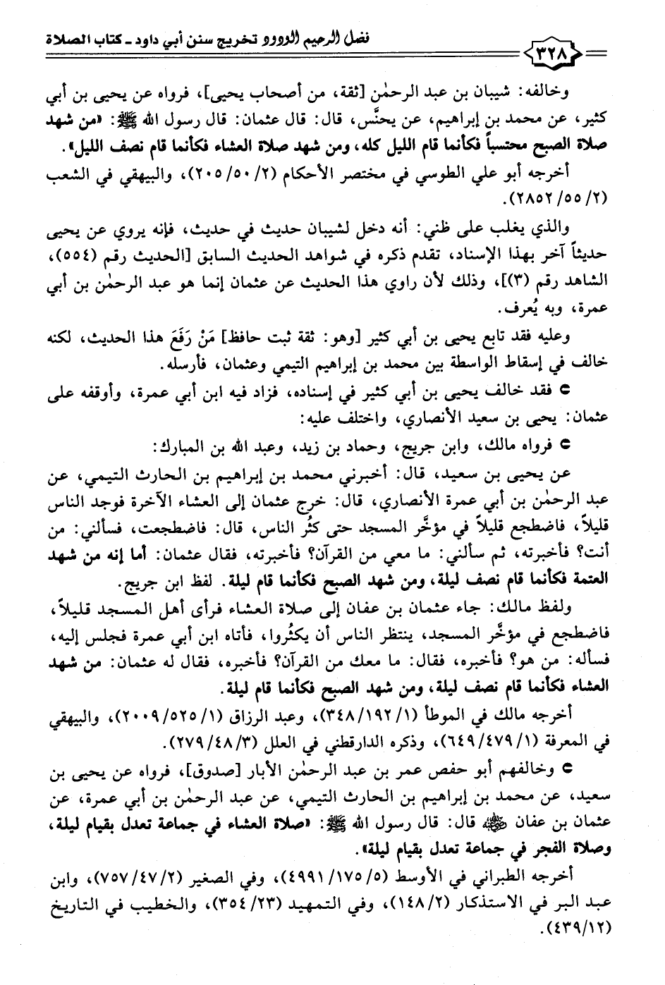 • وخالفهم أبو حفص عمر بن عبد الرحمن الأبار [صدوق]، فرواه عن يحيى بن سعيد، عن محمد بن إبراهيم بن الحارث التيمي، عن عبد الرحمن بن أبي عمرة، عن عثمان بن عفان - رضي الله عنه - قال: قال رسول الله - صلى الله عليه وسلم -: "صلاة العشاء في جماعة تعدل بقيام ليلة" وصلاة الفجر في جماعة تعدل بقيام ليلة".