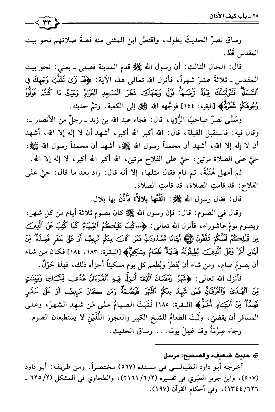 وسَمَّى نصرٌ صاحبَ الرُّؤيا، قال: فجاء عبد الله بن زيد -رجلٌ من الأنصار-، وقال فيه: فاستقبل القبلة، قال: الله أكبر الله أكبر، أشهد أن لا إله إلا الله، أشهد أن لا إله إلا الله، أشهد أن محمدًا رسول الله - صلى الله عليه وسلم -، أشهد أن محمدًا رسول الله - صلى الله عليه وسلم -، حيَّ على الصلاة مرتين، حيَّ على الفلاح مرتين، الله أكبر الله أكبر، لا إله إلا الله.