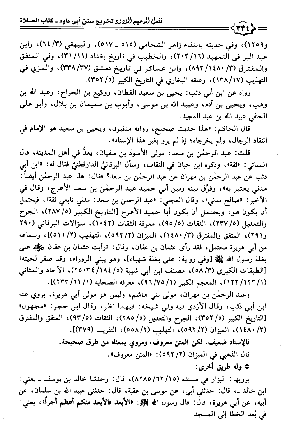 قلت: عبد الرحمن بن سعد، مولى الأسود بن سفيان، يعدُّ في أهل المدينة، قال النسائي: "ثقة"، وذكره ابن حبان في الثقات، وسأل البرقانيُّ الدارقطنيَّ فقال له: "ابن أبي ذئب عن عبد الرحمن بن مهران عن عبد الرحمن بن سعد؟ فقال: هذا عبد الرحمن أيضًا: مدني يعتبر به]، وفرَّق بينه وبين أبي حميد عبد الرحمن بن سعد الأعرج، وقال في الأخير: "صالح مدني"، وقال العجلي: "عبد الرحمن بن سعد: مدني تابعي ثقة"، فيحتمل أن يكون هو، ويحتمل أن يكون أبا حميد الأعرج [التاريخ الكبير (٥/ ٢٨٧)، الجرح والتعديل (٥/ ٢٣٧)، الثقات (٥/ ٩٥)، معرفة الثقات (١٠٤٢)، سؤالات البرقاني (٢٩٠ و ٢٩١)، المتفق والمفترق (٣/ ١٤٨٠)، الميزان (٢/ ٥٩٢)، التهذيب (٢/ ٥١١)]، وسماعه من أبي هريرة محتمل، فقد رأى عثمان بن عفان، وقال: "رأيت عثمان بن عفان - رضي الله عنه - على بغلة رسول الله - صلى الله عليه وسلم -[وفي رواية: على بغلة شهباء]، وهو يبني الزوراء، وقد صفر لحيته" [الطبقات الكبرى (٣/ ٥٨)، مصنف ابن أبي شيبة (٥/ ١٨٤/ ٢٥٠٣٤)، الآحاد والمثاني (١/ ١٢٣/ ١٢٢)، المعجم الكبير (١/ ٧٥/ ٩٦)، معرفة الصحابة (١/ ٦١/ ٢٣٣)].