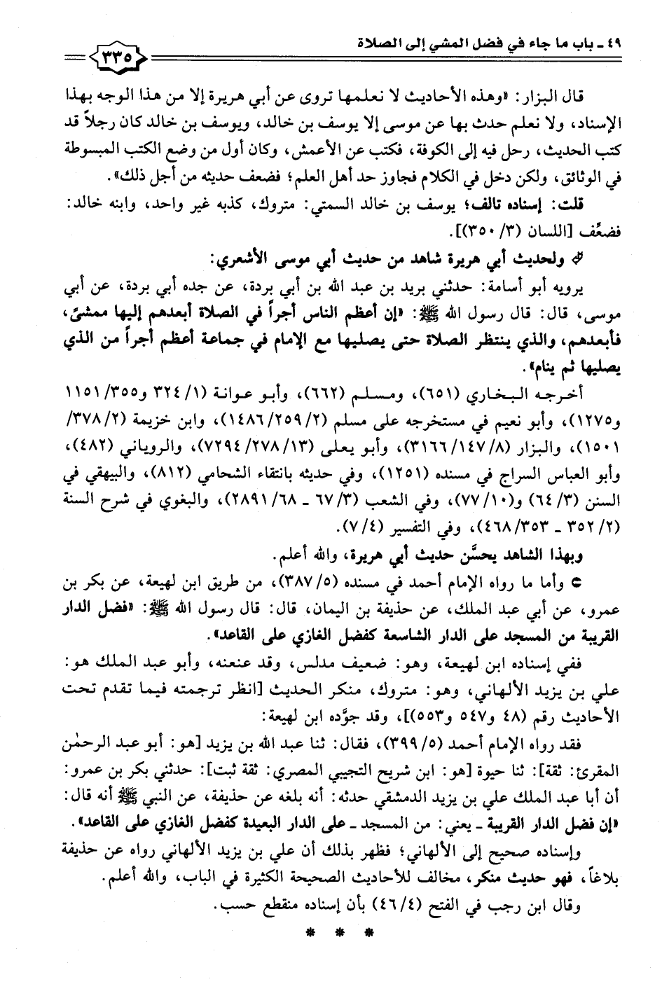 • وأما ما رواه الإمام أحمد في مسنده (٥/ ٣٨٧)، من طريق ابن لهيعة، عن بكر بن عمرو، عن أبي عبد الملك، عن حذيفة بن اليمان، قال: قال رسول الله - صلى الله عليه وسلم -: "فضل الدار القريبة من المسجد على الدار الشاسعة كفضل الغازي على القاعد".