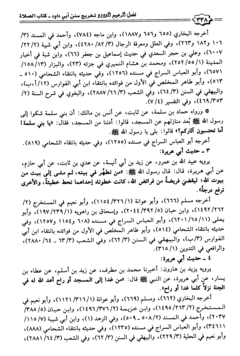 يرويه عبيد الله بن عمرو، عن زيد بن أبي أنيسة، عن عدي بن ثابت، عن أبي حازم، عن أبي هريرة، قال: قال رسول الله - صلى الله عليه وسلم -: "من تطهَّر في بيته، ثم مشى إلى بيت من بيوت الله؛ ليقضيَ فريضةً من فرائض الله، كانت خطوتاه إحداهما تحط خطيئةً، والأخرى ترفع درجةً".