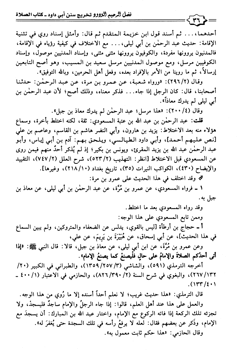 وقال (٢/ ٢٩٦): "ورواه شعبة، عن عمرو بن مرة، عن عبد الرحمن: حدثنا أصحابنا، قال: كان الرجل إذا جاء ... فذكر معناه، وذلك أصح؛ لأن عبد الرحمن بن أبي ليلى لم يدرك معاذًا".