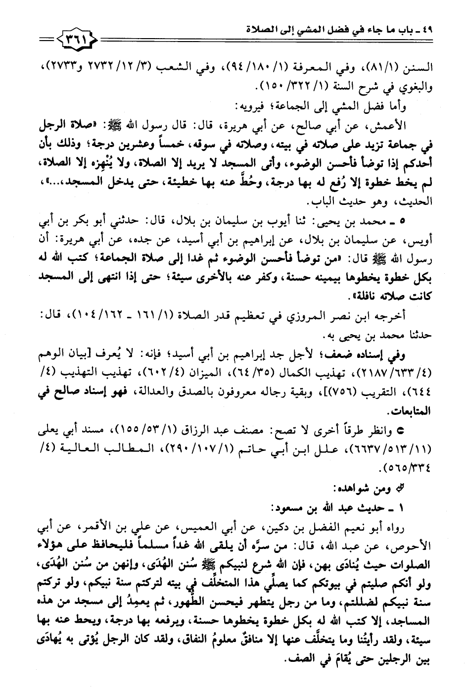 رواه أبو نعيم الفضل بن دكين، عن أبي العميس، عن علي بن الأقمر، عن أبي الأحوص، عن عبد الله، قال: من سرَّه أن يلقى الله غدًا مسلمًا فليحافظ على هؤلاء الصلوات حيث يُنادَى بهن، فإن الله شرع لنبيكم - صلى الله عليه وسلم - سُنن الهُدَى، وإنهن من سُنن الهُدَى، ولو أنكم صليتم في بيوتكم كما يصلِّي هذا المتخلِّف في بيته لتركتم سنة نبيكم، ولو تركتم سنة نبيكم لضللتم، وما من رجل يتطهر فيحسن الطهور، ثم يعمِدُ إلى مسجد من هذه المساجد، إلا كتب الله له بكل خطوة يخطوها حسنة، ويرفعه بها درجة، ويحط عنه بها سيئة، ولقد رأيتُنا وما يتخلَّف عنها إلا منافقٌ معلومُ النفاق، ولقد كان الرجل يُؤتى به يُهادَى بين الرجلين حتى يُقامَ في الصف.