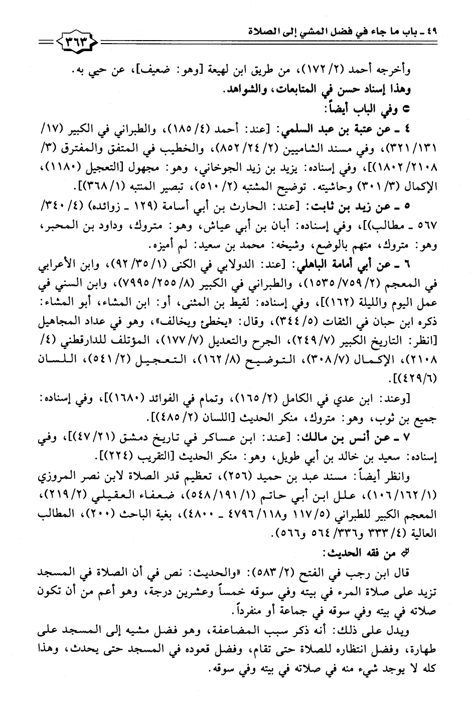 قال ابن رجب في الفتح (٢/ ٥٨٣): "والحديث: نص في أن الصلاة في المسجد تزيد على صلاة المرء في بيته وفي سوقه خمسًا وعشرين درجة، وهو أعم من أن تكون صلاته في بيته وفي سوقه في جماعة أو منفردًا.