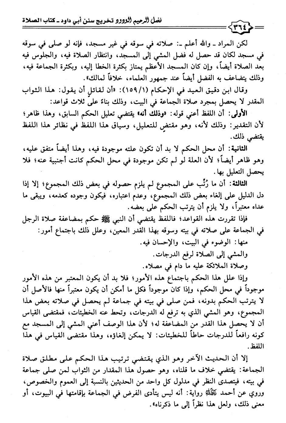 وقال ابن دقيق العيد في الإحكام (١/ ١٥٩): "أن لقائلٍ أن يقول: هذا الثواب المقدر لا يحصل بمجرد صلاة الجماعة في البيت، وذلك بناءً على ثلاث قواعد: