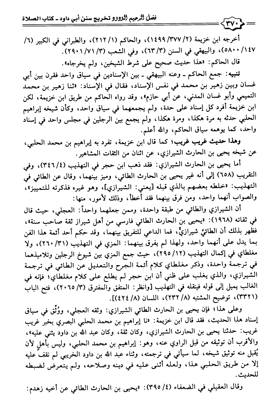 تنبيه: جمع الحاكم -وعنه البيهقي- بين الإسنادين في سياق واحد فقرن بين أبي غسان وبين زهير بن محمد في نفس الإسناد، فقال في الإسناد: "ثنا زهير بن محمد التميمي وأبو غسان المدني، عن أبي حازم"، وقد رواه الحاكم من طريق ابن خزيمة، لكن ابن خزيمة أفرد كل إسناد على حدة، ولم يجمعهما في سياق واحد، وكأن شيخه إبراهيم الحلبي حدثه به مرة هكذا، ومرة هكذا، ولم يجمع بين الرجلين في مجلس واحد في إسناد واحد، كما يوهمه سياق الحاكم، والله أعلم.