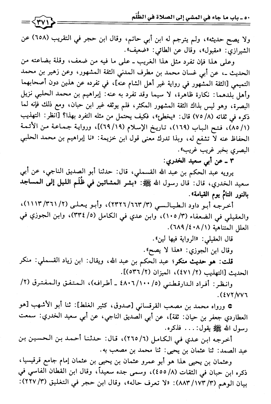 يرويه عبد الحكم بن عبد الله القسملي، قال: حدثنا أبو الصديق الناجي، عن أبي سعيد الخدري، قال: قال رسول الله - صلى الله عليه وسلم -: "بشر المشائين في ظُلَم الليل إلى المساجد بالنور التامِّ يوم القيامة".