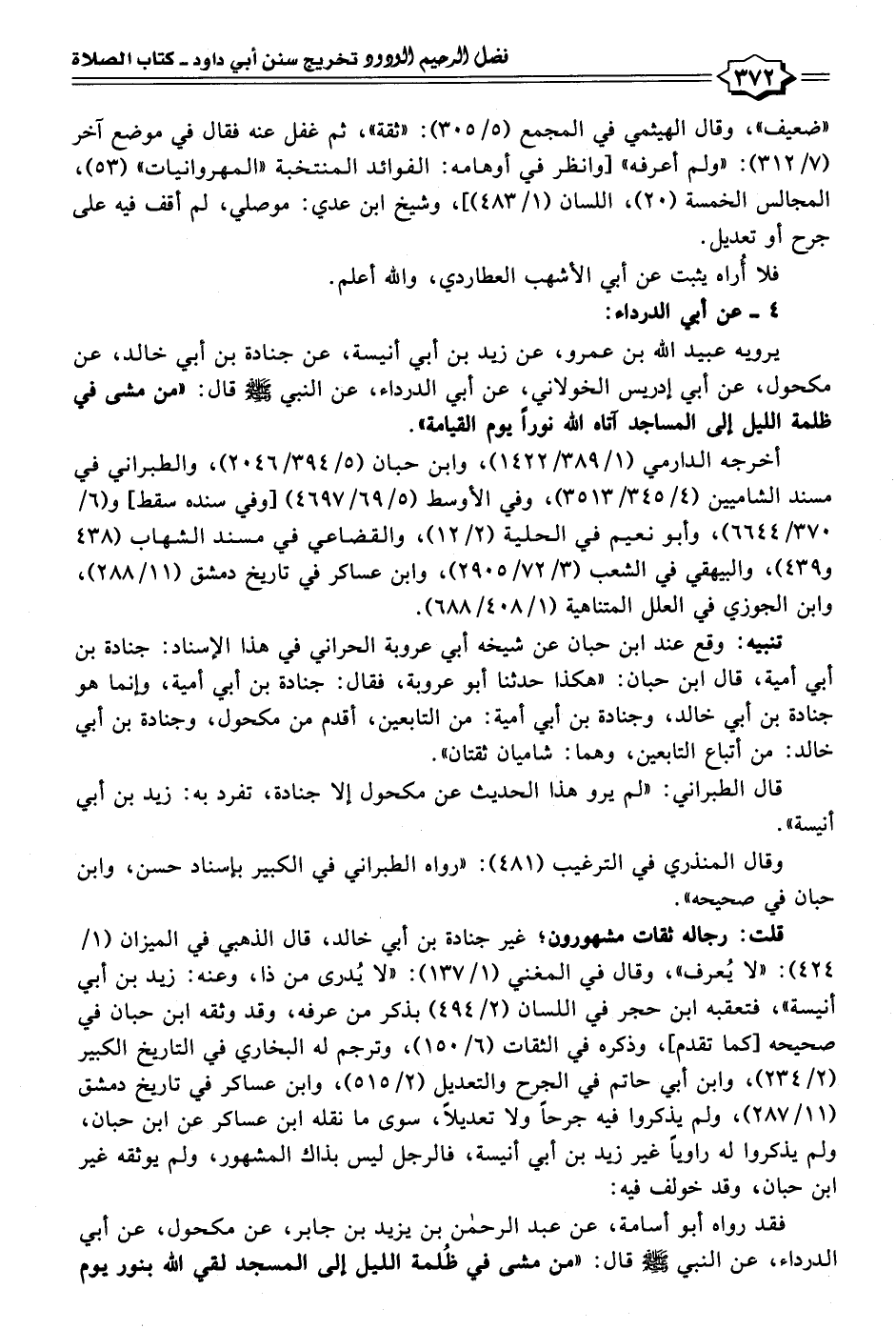 يرويه عبيد الله بن عمرو، عن زيد بن أبي أنيسة، عن جنادة بن أبي خالد، عن مكحول، عن أبي إدريس الخولاني، عن أبي الدرداء، عن النبي - صلى الله عليه وسلم - قال: "من مشى في ظلمة الليل إلى المساجد آتاه الله نورًا يوم القيامة".