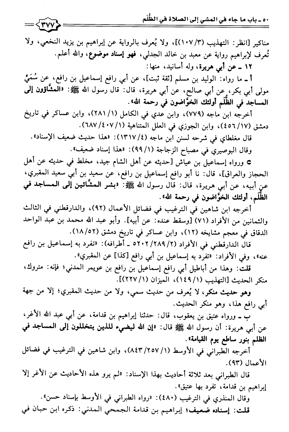 ب- ورواه عتيق بن يعقوب، قال: حدثنا إبراهيم بن قدامة، عن أبي عبد الله الأغر، عن أبي هريرة: أن رسول الله - صلى الله عليه وسلم - قال: "إن الله ليضيء للذين يتخللون إلى المساجد في الظلم بنور ساطع يوم القيامة".