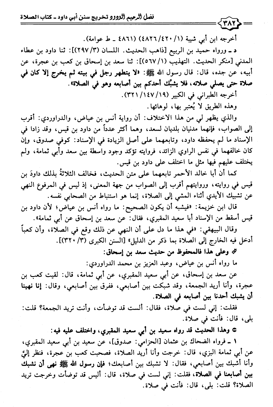 عن سعد بن إسحاق، عن أبي سعيد المقبري، عن أبي ثمامة، قال: لقيت كعب بن عجرة، وأنا أريد الجمعة، وقد شبكت بين أصابعي، ففرق بين أصابعي، وقال: إنا نهينا أن يشبك أحدنا بين أصابعه في الصلاة.