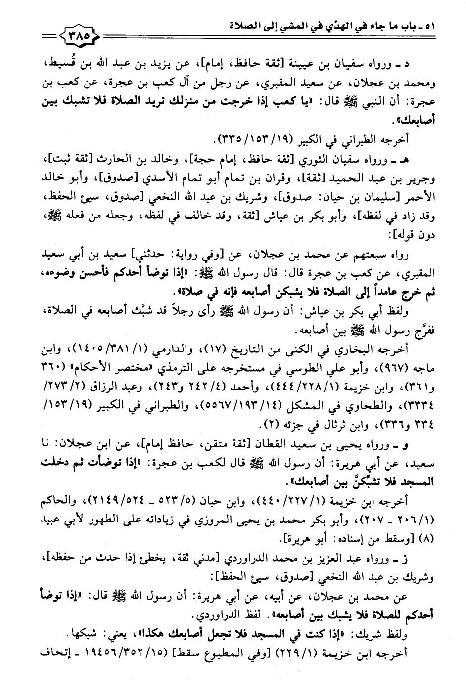 د- ورواه سفيان بن عيينة [ثقة حافظ، إمام]، عن يزيد بن عبد الله بن قُسيط، ومحمد بن عجلان، عن سعيد المقبري، عن رجل من آل كعب بن عجرة، عن كعب بن عجرة: أن النبي - صلى الله عليه وسلم - قال: "يا كعب إذا خرجت من منزلك تريد الصلاة فلا تشبك بين أصابعك".