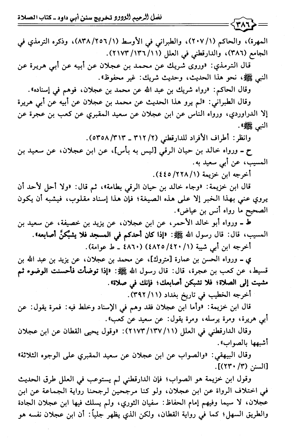 ي- ورواه الحسن بن عمارة [متروك]، عن محمد بن عجلان، عن يزيد بن عبد الله بن قسيط، عن كعب بن عجرة، قال: قال رسول الله - صلى الله عليه وسلم -: "إذا توضأت فأحسنت الوضوء ثم مشيت إلى الصلاة؛ فلا تشبكن أصابعك؛ فإنك في صلاة".