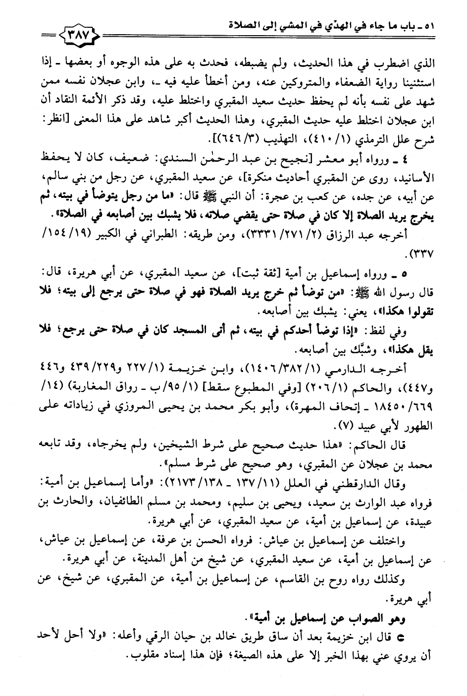 ٥ - ورواه إسماعيل بن أمية [ثقة ثبت]، عن سعيد المقبري، عن أبي هريرة، قال: قال رسول الله - صلى الله عليه وسلم -: "من توضأ ثم خرج يريد الصلاة فهو في صلاة حتى يرجع إلى بيته؛ فلا تقولوا هكذا"، يعني: يشبك بين أصابعه.