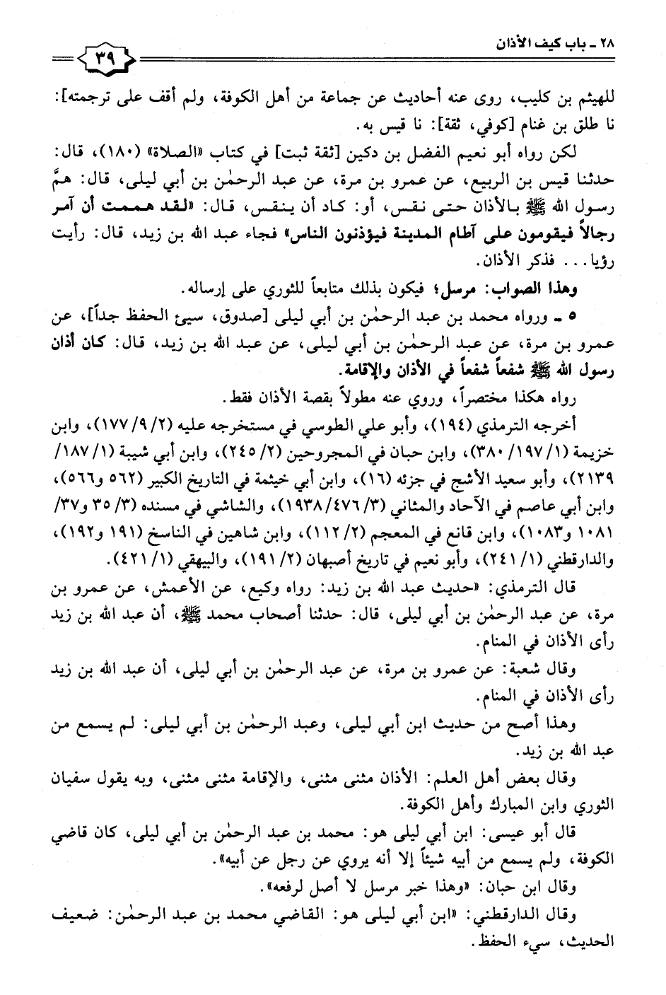 قال الترمذي: "حديث عبد الله بن زيد: رواه وكيع، عن الأعمش، عن عمرو بن مرة، عن عبد الرحمن بن أبي ليلى، قال: حدثنا أصحاب محمد - صلى الله عليه وسلم -، أن عبد الله بن زيد رأي الأذان في المنام.