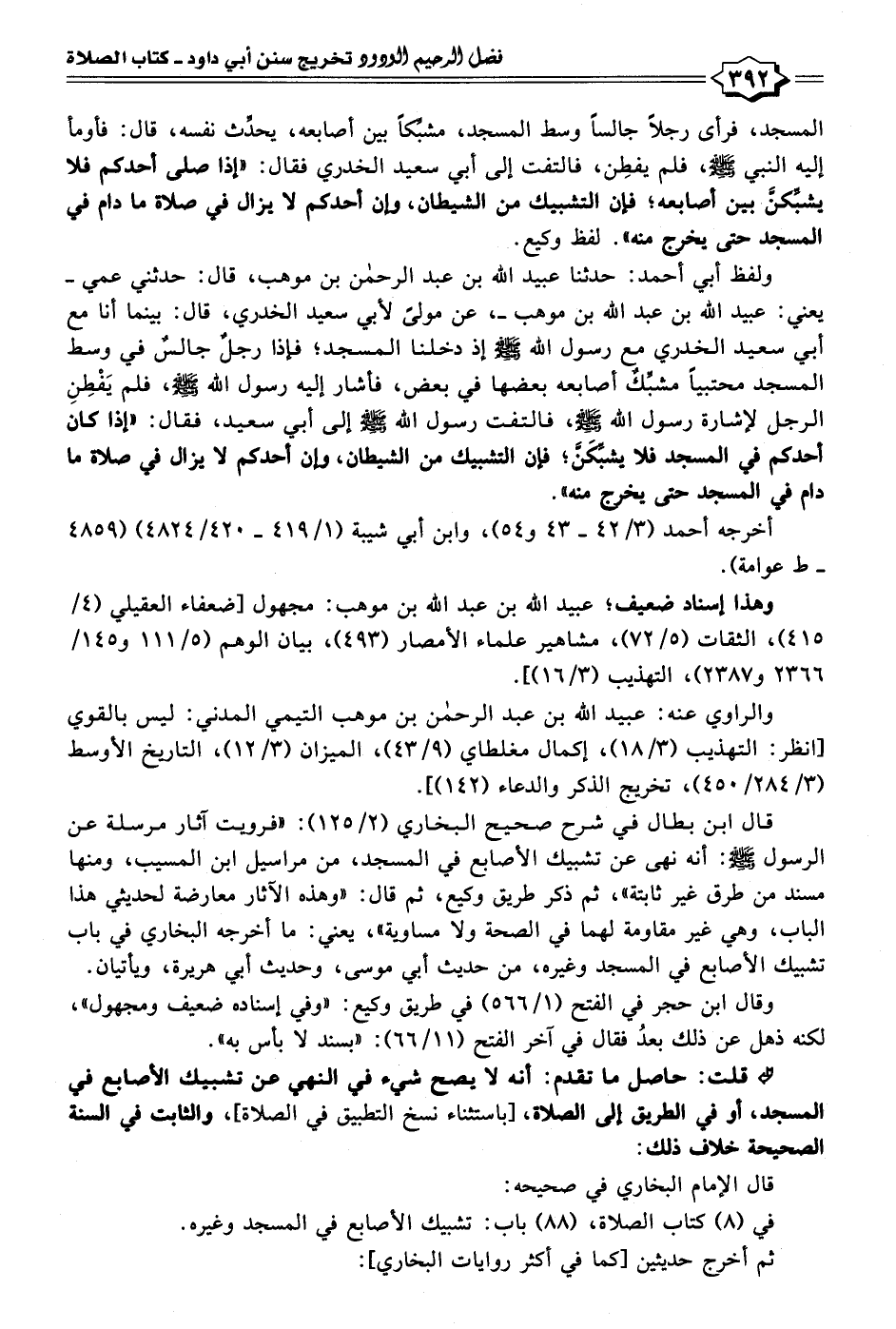 • قلت: حاصل ما تقدم: أنه لا يصح شيء في النهي عن تشبيك الأصابع في المسجد، أو في الطريق إلى الصلاة، [باستثناء نسخ التطبيق في الصلاة]، والثابت في السنة الصحيحة خلاف ذلك:
