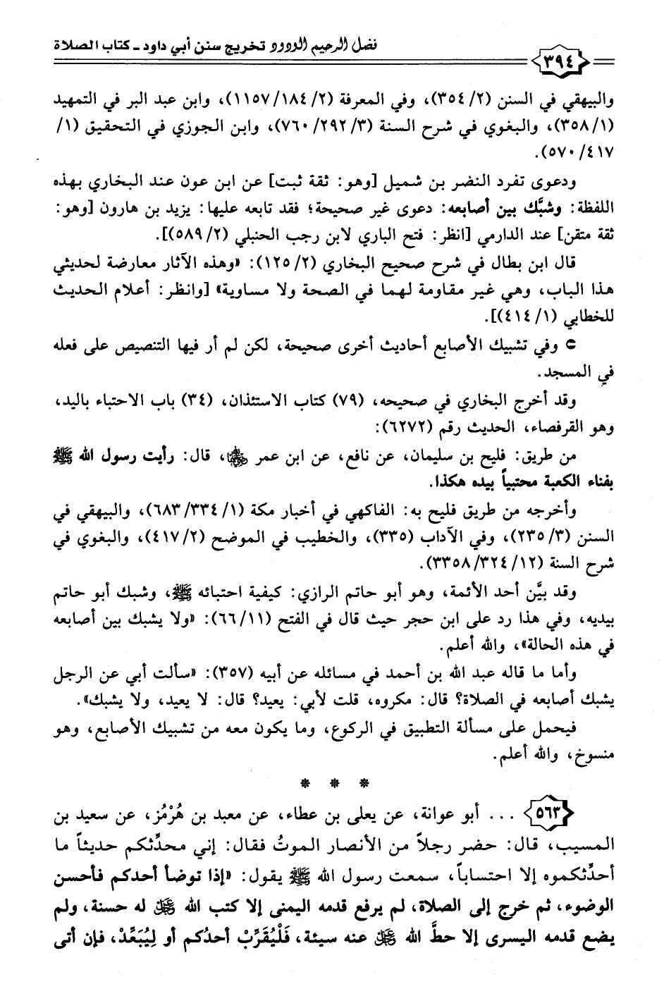 وقد بيَّن أحد الأئمة، وهو أبو حاتم الرازي: كيفية احتبائه - صلى الله عليه وسلم -، وشبك أبو حاتم بيديه، وفي هذا رد على ابن حجر حيث قال في الفتح (١١/ ٦٦): "ولا يشبك بين أصابعه في هذه الحالة"، والله أعلم.