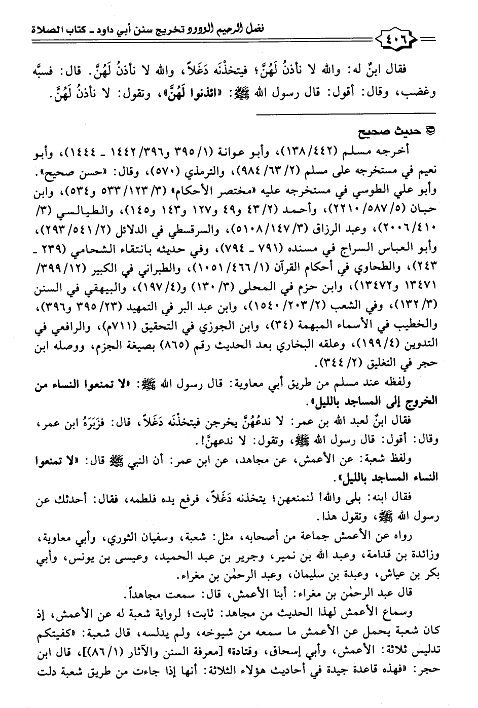 فقال ابنٌ لعبد الله بن عمر: لا ندعُهُنَّ يخرجن فيتخذْنَه دَغَلًا، قال: فزَبَرَهُ ابن عمر، وقال: أقول: قال رسول الله - صلى الله عليه وسلم -، وتقول: لا ندعهنَّ!.