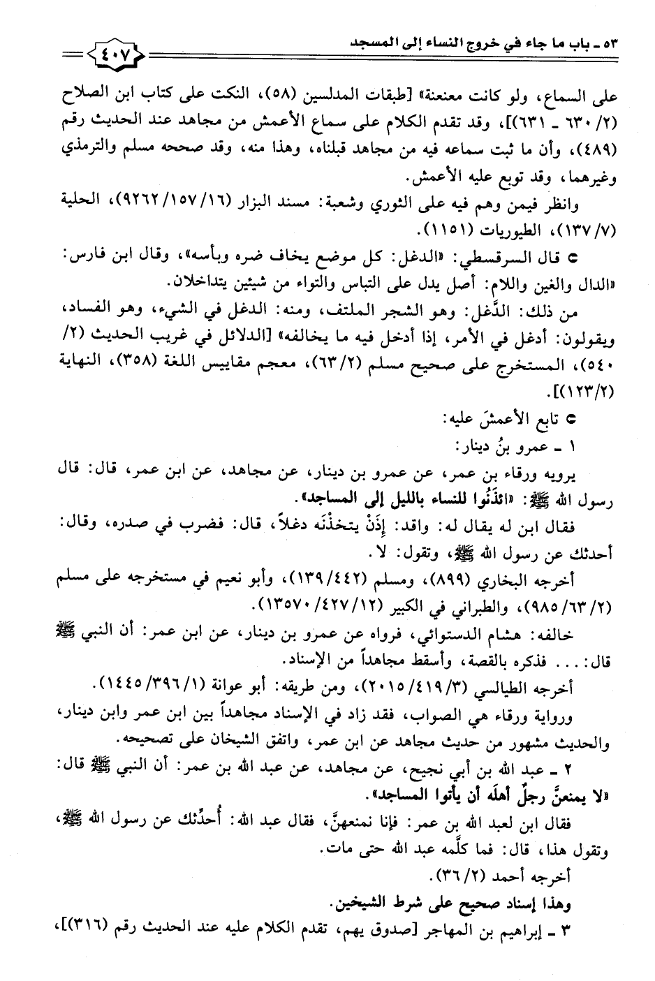 ٢ - عبد الله بن أبي نجيح، عن مجاهد، عن عبد الله بن عمر: أن النبي - صلى الله عليه وسلم - قال: "لا يمنعنَّ رجلٌ أهلَه أن يأتوا المساجد".