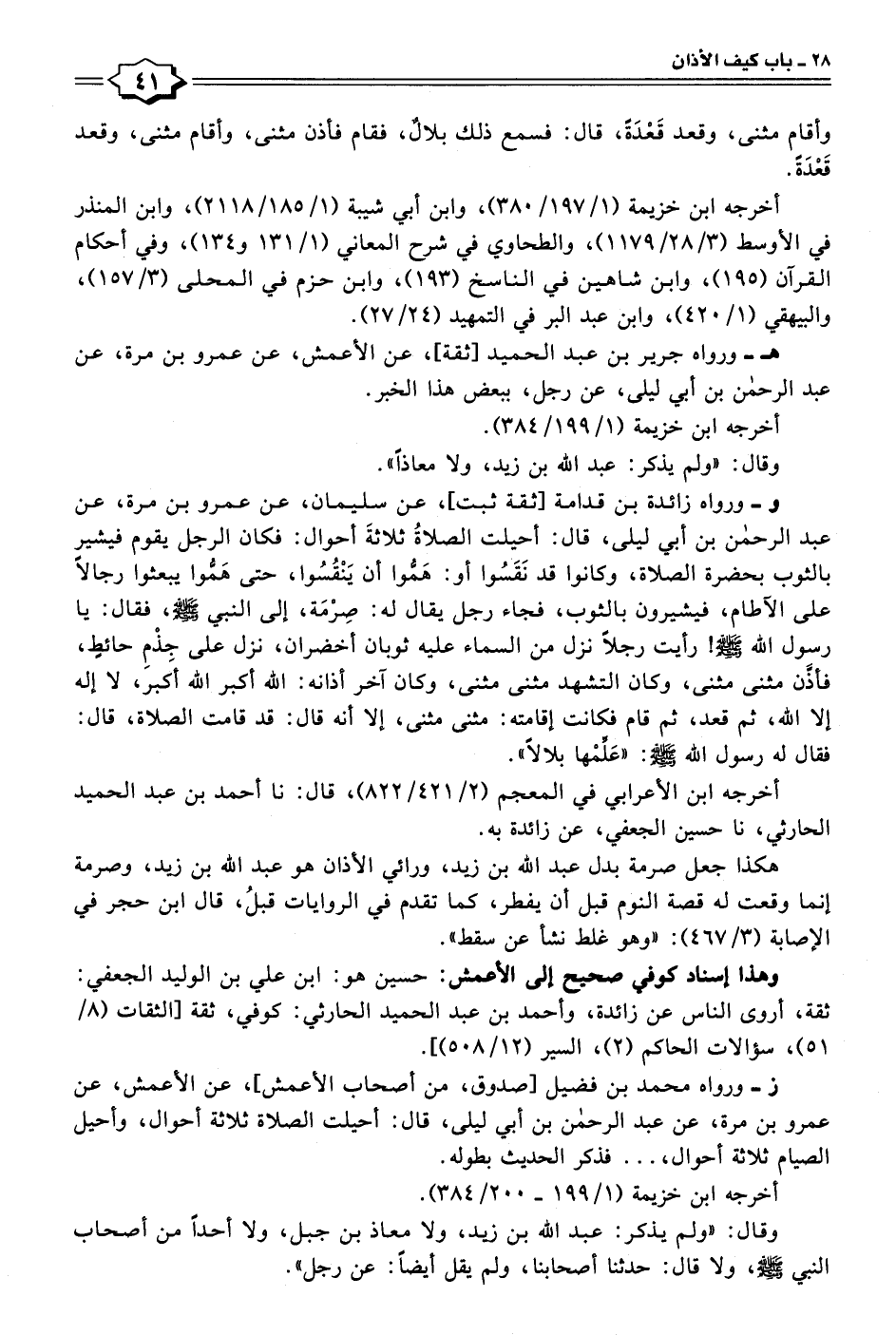 و- ورواه زائدة بن قدامة [ثقة ثبت]، عن سليمان، عن عمرو بن مرة، عن عبد الرحمن بن أبي ليلى، قال: أحيلت الصلاةُ ثلاثةَ أحوال: فإن الرجل يقوم فيشير بالثوب بحضرة الصلاة، وكانوا قد نَقَسُوا أو: هَمُّوا أن يَنْقُسُوا، حتى هَمُّوا يبعثوا رجالًا على الآطام، فيشيرون بالثوب، فجاء رجل يقال له: صِرْمَة، إلى النبي - صلى الله عليه وسلم -، فقال: يا رسول الله - صلى الله عليه وسلم -! رأيت رجلًا نزل من السماء عليه ثوبان أخضران، نزل على جذْمِ حائطٍ، فأذَّن مثنى مثنى، وكان التشهد مثنى مثنى، وكان آخر أذانه: الله أكبر الله أكبر، لا إله إلا الله، ثم قعد، ثم قام فكانت إقامته: مثنى مثنى، إلا أنه قال: قد قامت الصلاة، قال: فقال له رسول الله - صلى الله عليه وسلم -: "عَلِّمْها بلالًا".