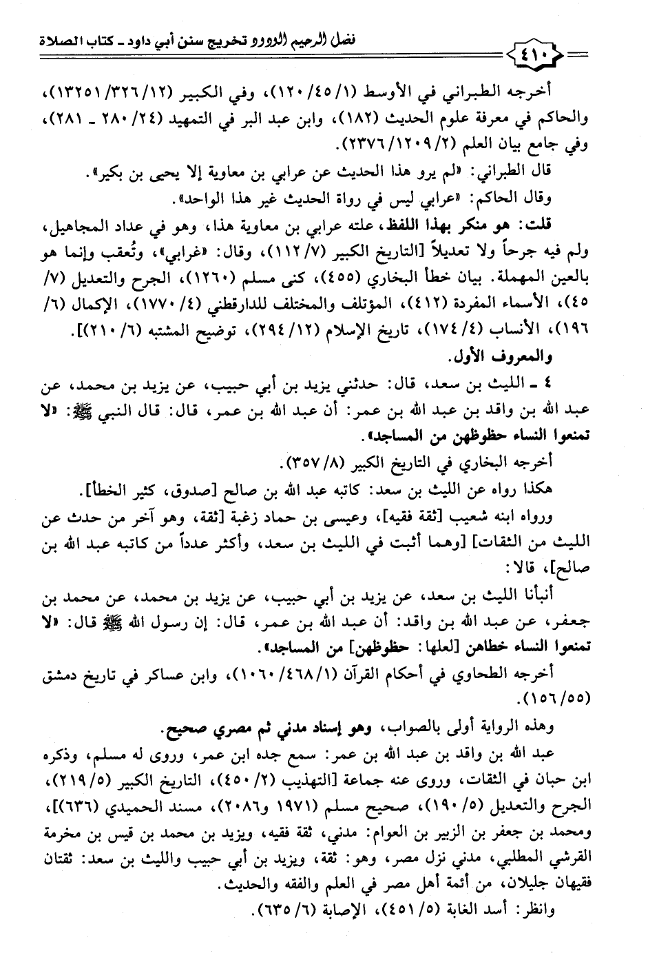 ٤ - الليث بن سعد، قال: حدثني يزيد بن أبي حبيب، عن يزيد بن محمد، عن عبد الله بن واقد بن عبد الله بن عمر: أن عبد الله بن عمر، قال: قال النبي - صلى الله عليه وسلم -: "لا تمنعوا النساء حظوظهن من المساجد".