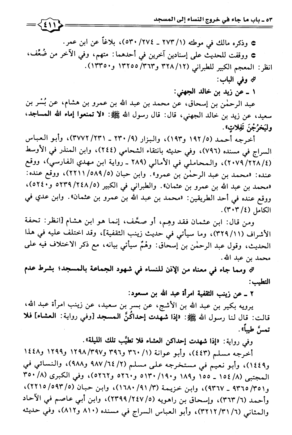 عبد الرحمن بن إسحاق، عن محمد بن عبد الله بن عمرو بن هشام، عن بُسْر بن سعيد، عن زيد بن خالد الجهني، قال: قال رسول الله - صلى الله عليه وسلم -: "لا تمنعوا إماء الله المساجد، وليَخرُجْنَ تَفِلاتٍ".