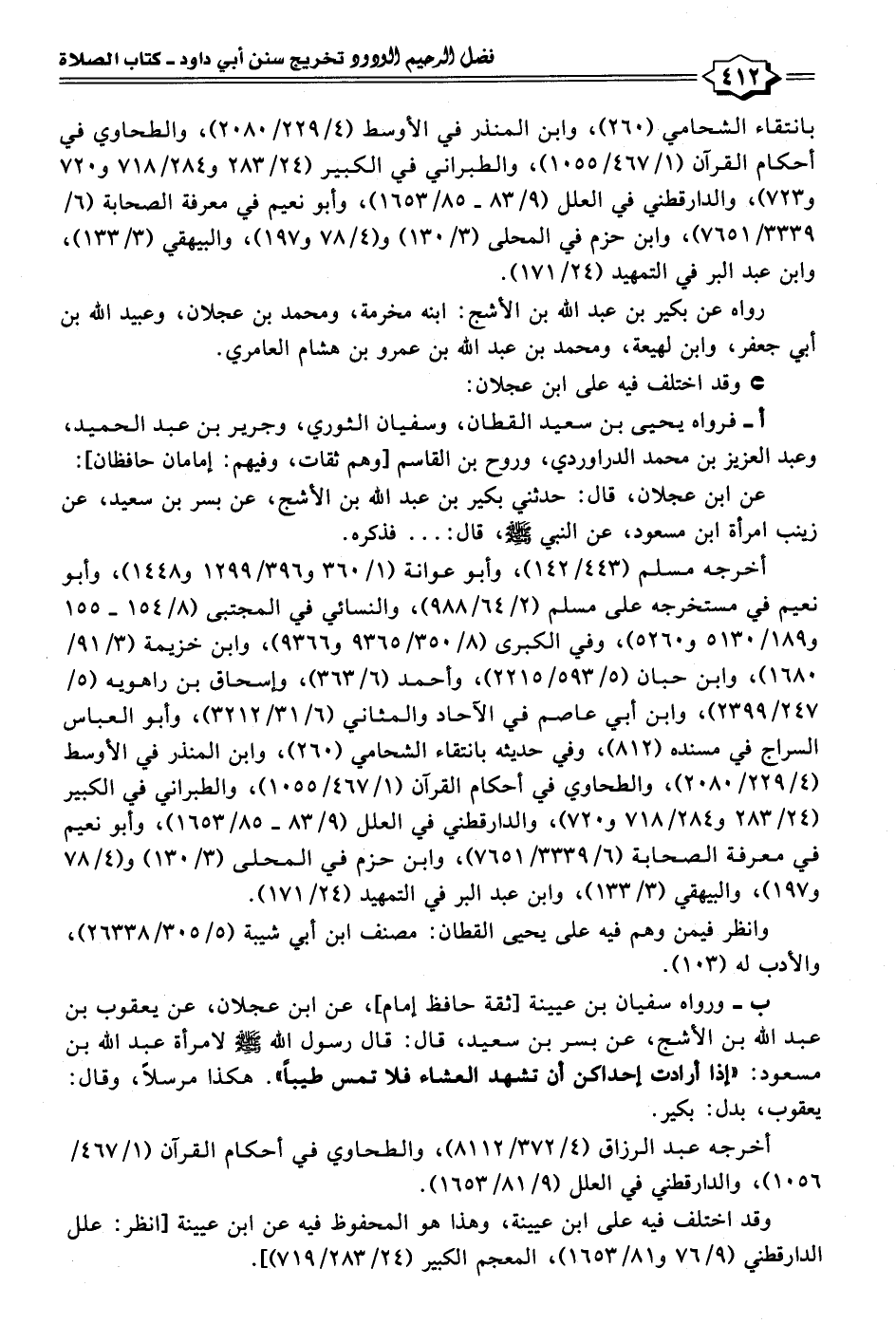 ب- ورواه سفيان بن عيينة [ثقة حافظ إمام]، عن ابن عجلان، عن يعقوب بن عبد الله بن الأشج، عن بسر بن سعيد، قال: قال رسول الله - صلى الله عليه وسلم - لامرأة عبد الله بن مسعود: "إذا أرادت إحداكن أن تشهد العشاء فلا تمس طيبًا". هكذا مرسلًا، وقال: يعقوب، بدل: بكير.