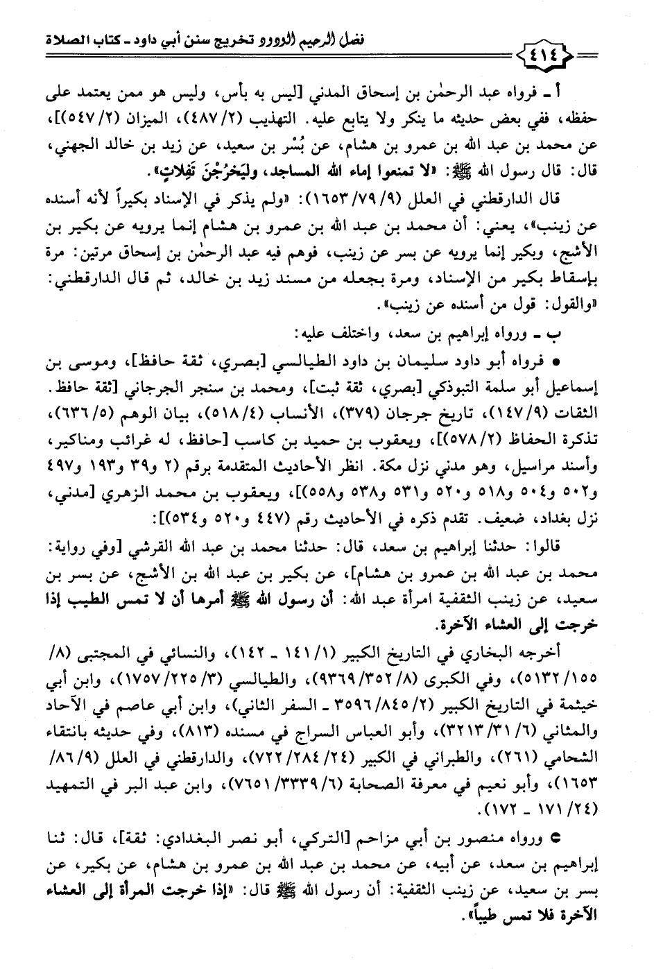 قالوا: حدثنا إبراهيم بن سعد، قال: حدثنا محمد بن عبد الله القرشي [وفي رواية: محمد بن عبد الله بن عمرو بن هشام]، عن بكير بن عبد الله بن الأشج، عن بسر بن سعيد، عن زينب الثقفية امرأة عبد الله: أن رسول الله - صلى الله عليه وسلم - أمرها أن لا تمس الطيب إذا خرجت إلى العشاء الآخرة.