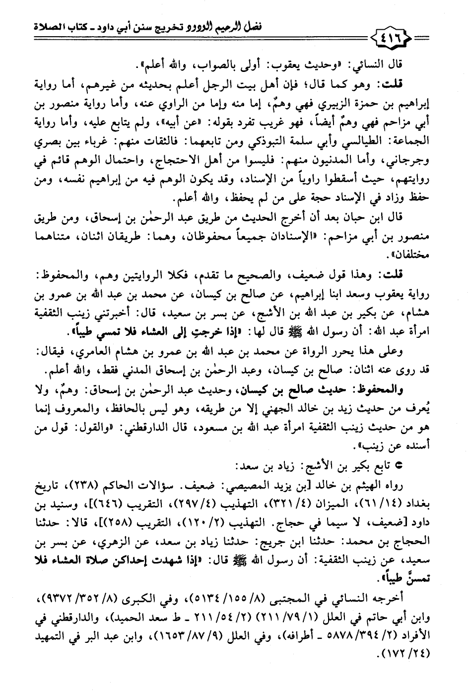 قلت: وهذا قول ضعيف، والصحيح ما تقدم، فكلا الروايتين وهم، والمحفوظ: رواية يعقوب وسعد ابنا إبراهيم، عن صالح بن كيسان، عن محمد بن عبد الله بن عمرو بن هشام، عن بكير بن عبد الله بن الأشج، عن بسر بن سعيد، قال: أخبرتني زينب الثقفية امرأة عبد الله: أن رسول الله - صلى الله عليه وسلم - قال لها: "إذا خرجتِ إلى العشاء فلا تمسي طيبًا".
