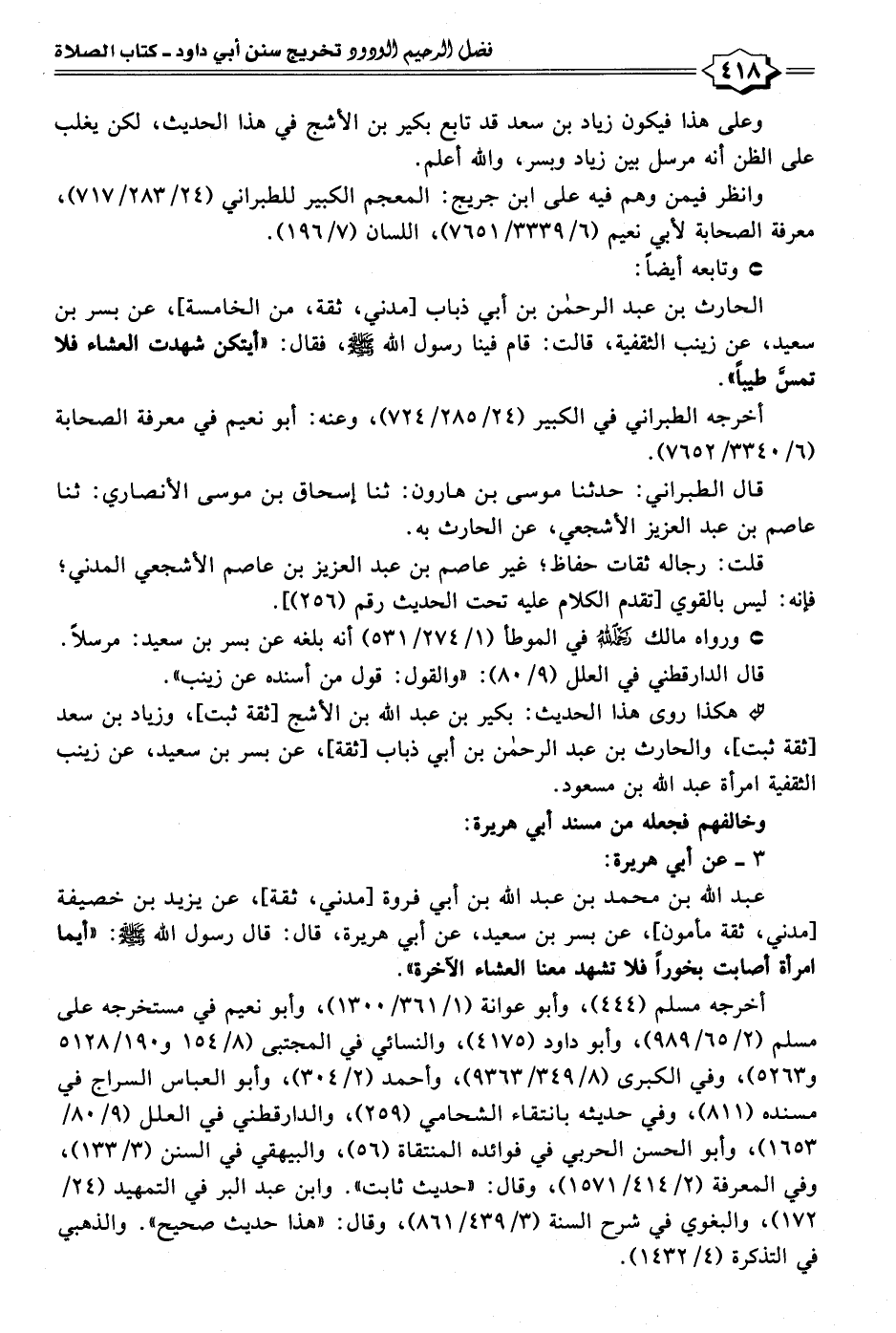 الحارث بن عبد الرحمن بن أبي ذباب [مدني، ثقة، من الخامسة]، عن بسر بن سعيد، عن زينب الثقفية، قالت: قام فينا رسول الله - صلى الله عليه وسلم -، فقال: "أيتكن شهدت العشاء فلا تمسن طيبًا".