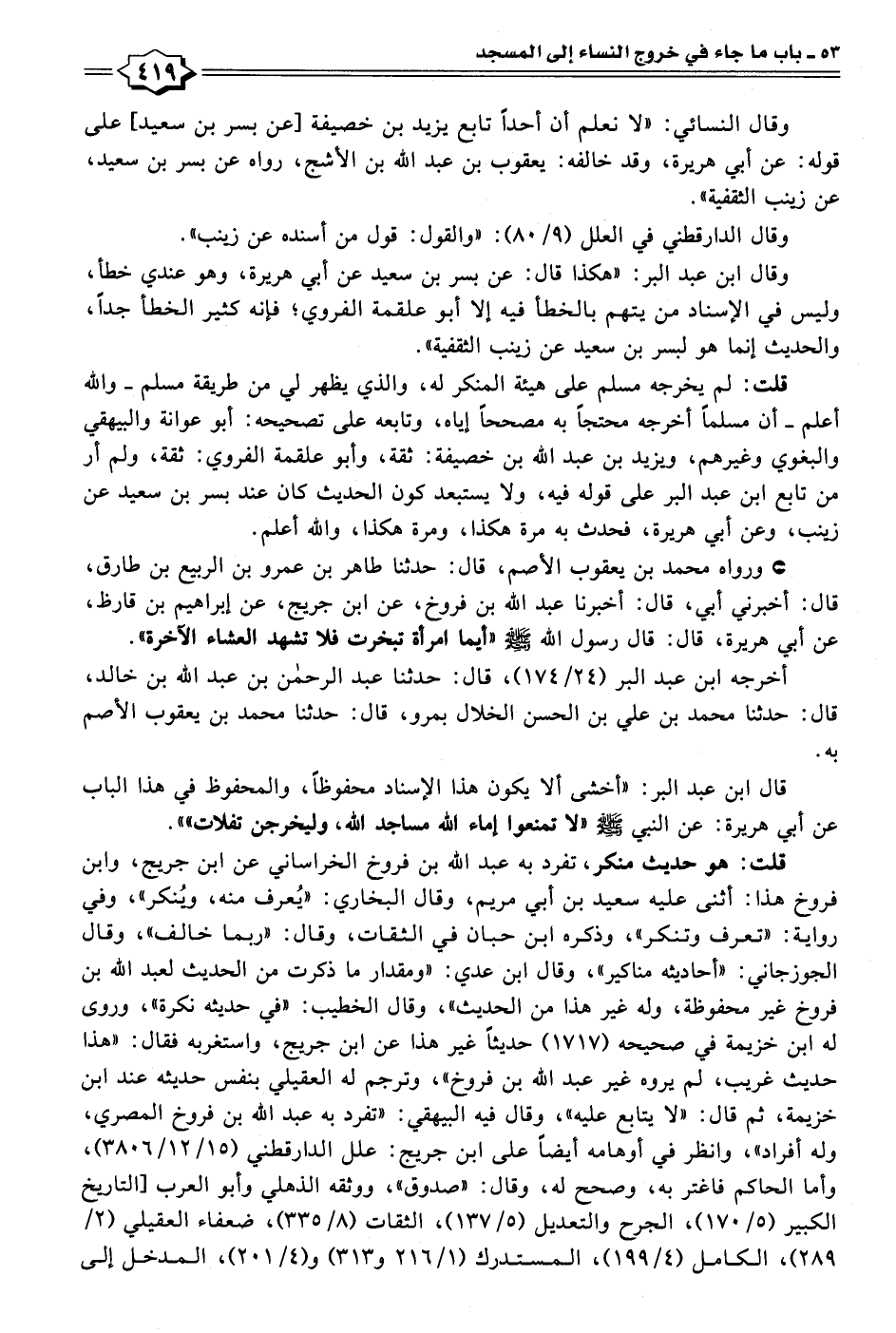 قال ابن عبد البر: "أخشى ألا يكون هذا الإسناد محفوظًا، والمحفوظ في هذا الباب عن أبي هريرة: عن النبي - صلى الله عليه وسلم - "لا تمنعوا إماء الله مساجد الله، وليخرجن تفلات"".