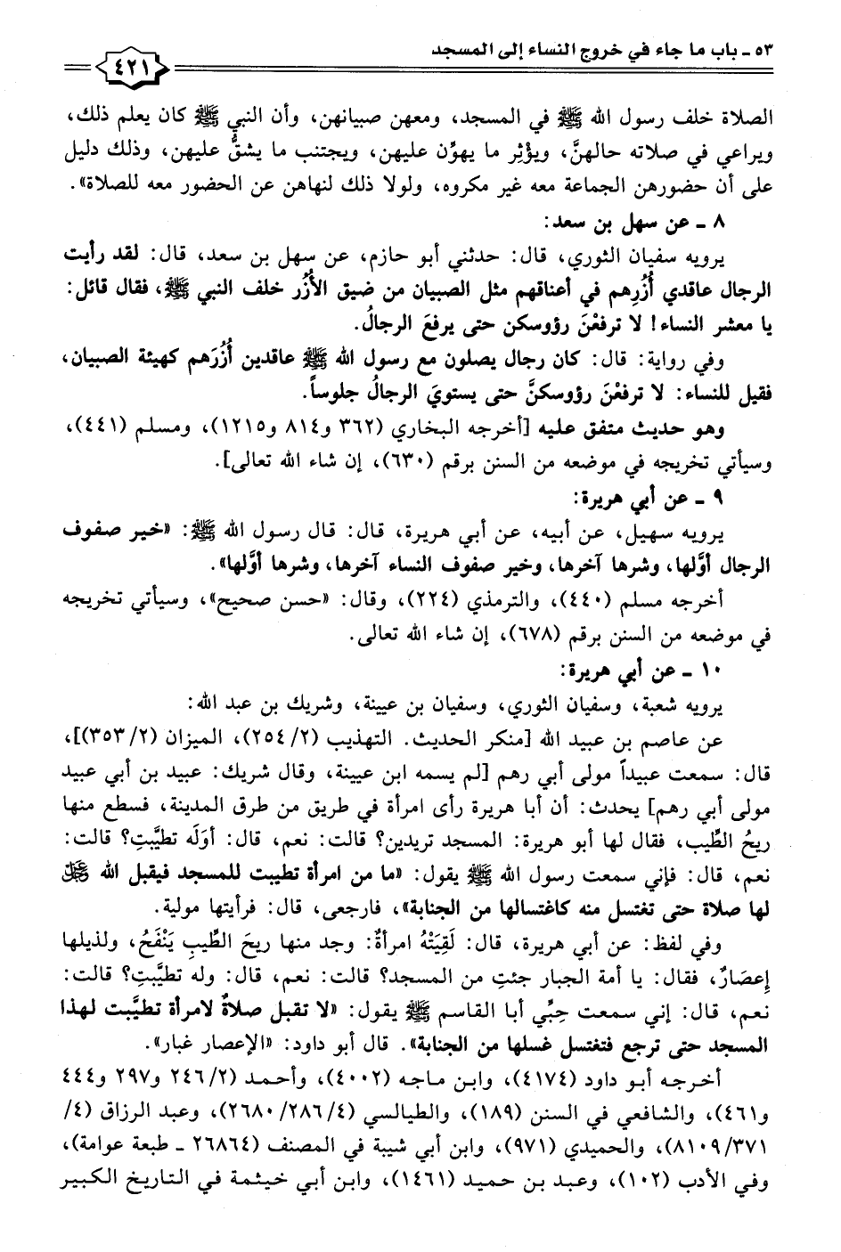 وفي لفظ: عن أبي هريرة، قال: لَقِيَتْهُ امرأةٌ: وجد منها ريحَ الطِّيب يَنْفَحُ، ولذيلها إِعصَارٌ، فقال: يا أمة الجبار جئتِ من المسجد؟ قالت: نعم، قال: ولهَ تطيَّبتِ؟ قالت: نعم، قال: إني سمعت حِبِّي أبا القاسم - صلى الله عليه وسلم - يقول: "لا تقبل صلاةٌ لامرأة تطيَّبت لهذا المسجد حتى ترجع فتغتسل غسلها من الجنابة". قال أبو داود: "الإعصار غبار".