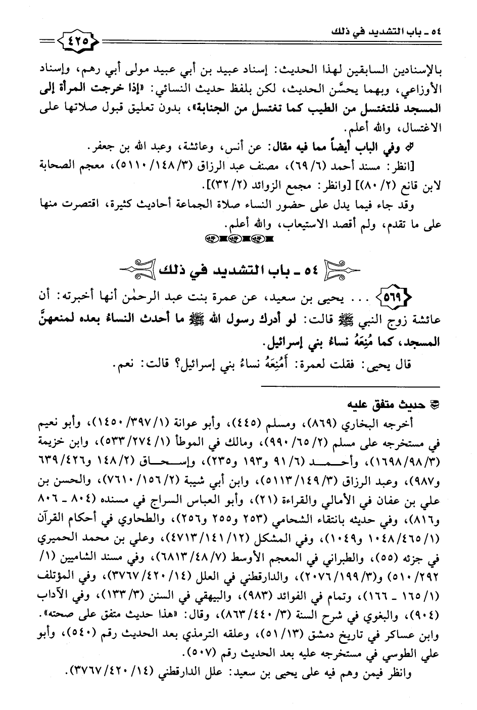 ٥٦٩ - . . . يحيى بن سعيد، عن عمرة بنت عبد الرحمن أنها أخبرته: أن عائشة زوج النبي - صلى الله عليه وسلم - قالت: لو أدرك رسول الله - صلى الله عليه وسلم - ما أحدث النساءُ بعده لمنعهنَّ المسجد، كما مُنِعَهُ نساءُ بني إسرائيل.