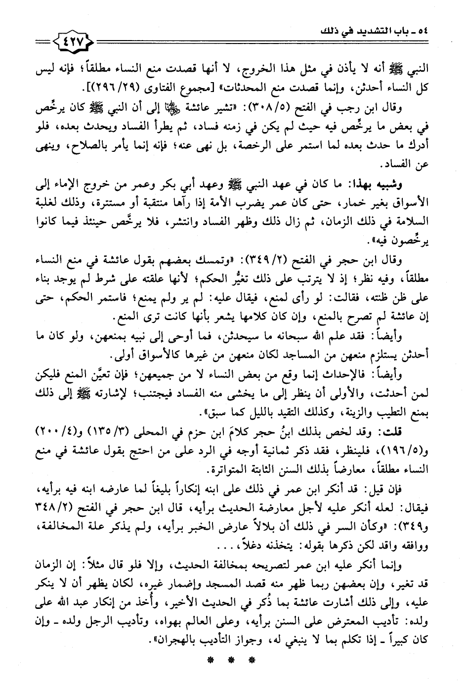 قلت: وقد لخص بذلك ابنُ حجر كلامَ ابن حزم في المحلى (٣/ ١٣٥) و (٤/ ٢٠٠) و (٥/ ١٩٦)، فلينظر، فقد ذكر ثمانية أوجه في الرد على من احتج بقول عائشة في منع النساء مطلقًا، معارضًا بذلك السنن الثابتة المتواترة.