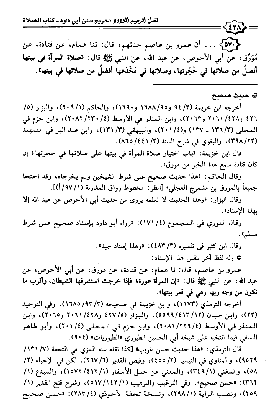 ٥٧٠ - . . . أن عمرو بن عاصم حدثهم، قال: ثنا همام، عن قتادة، عن مُوَرِّق، عن أبي الأحوص، عن عبد الله، عن النبي - صلى الله عليه وسلم - قال: "صلاة المرأة في بيتها أفضلُ من صلاتها في حُجْرتها، وصلاتها في مَخْدَعها أفضلُ من صلاتها في بيتها".