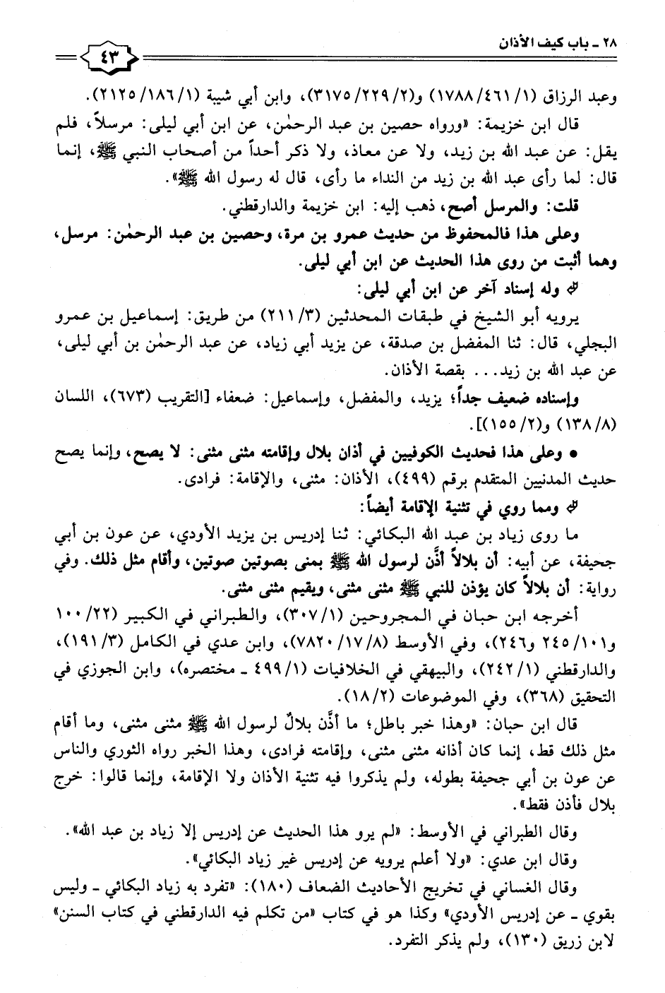 قال ابن حبان: "وهذا خبر باطل؛ ما أذَّن بلالٌ لرسول الله - صلى الله عليه وسلم - مثنى مثنى، وما أقام مثل ذلك قط، إنما كان أذانه مثنى مثنى، وإقامته فرادى، وهذا الخبر رواه الثوري والناس عن عون بن أبي جحيفة بطوله، ولم يذكروا فيه تثنية الأذان ولا الإقامة، وإنما قالوا: خرج بلال فأذن فقط".