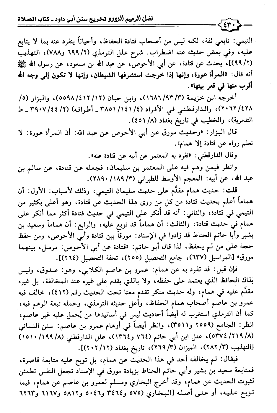 قلت: حديث همام مقدَّم على حديث سليمان التيمي، وذلك لأسباب: الأول: أن همامًا أعلم بحديث قتادة من كل من روى هذا الحديث عن قتادة، وهو أعلى بكثير من التيمي في قتادة، والثاني: أنه قد أنكر على التيمي في حديث قتادة أكثر مما أنكر على همام في حديث قتادة، والثالث: أن همامًا قد توبع عليه، والرابع: أن همامًا وسعيد بن بشير وأبا حاتم الحناط قد زادوا في الإسناد: مورقًا بين قتادة وأبي الأحوص، ومن حفظ حجة على من لم يحفظ، لذا قال أبو حاتم: "قتادة عن أبي الأحوص: مرسل، بينهما مورق" [المراسيل (٦٣٧)، جامع التحصيل (٢٥٥)، تحفة التحصيل (٢٦٤)].