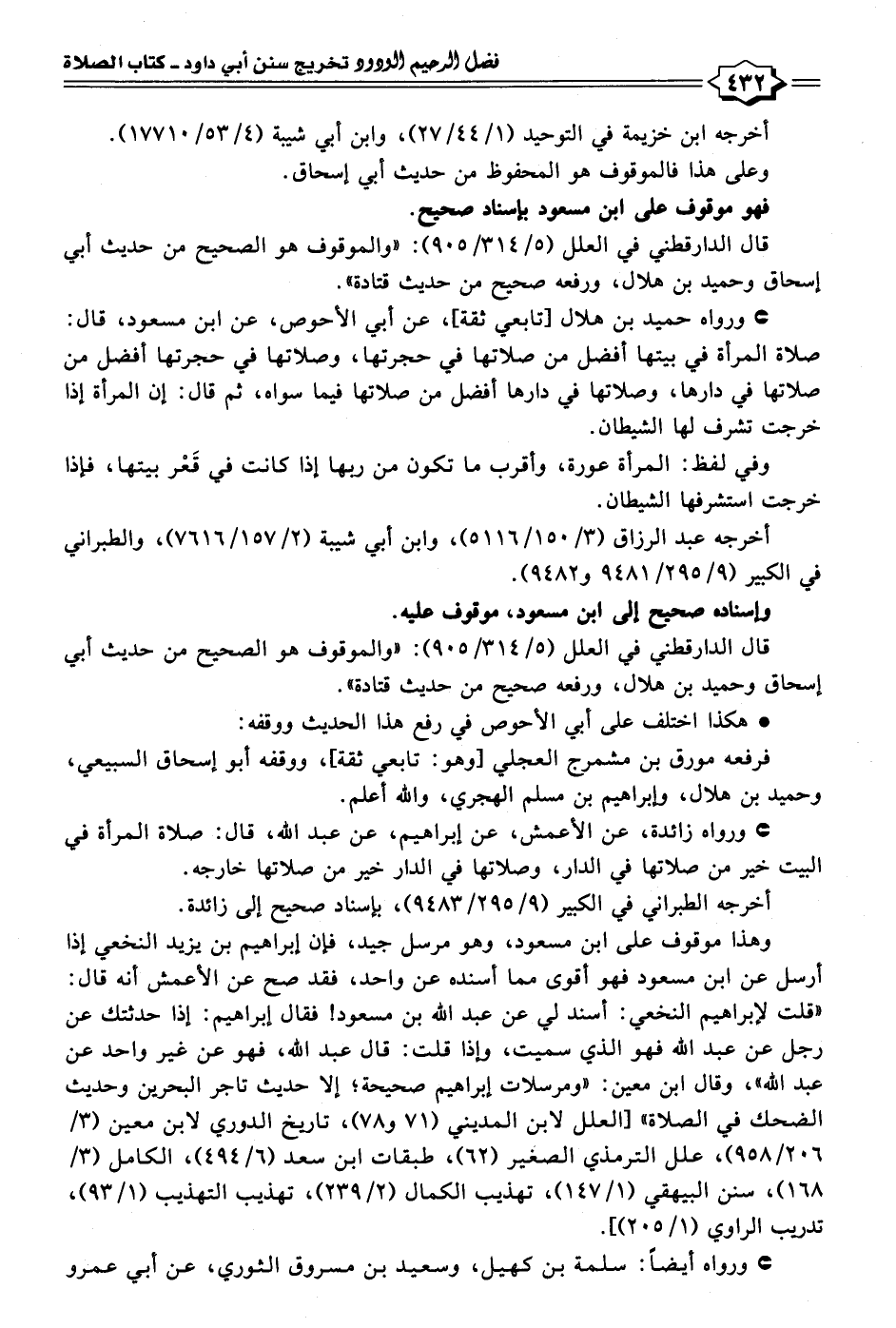 • ورواه حميد بن هلال [تابعي ثقة]، عن أبي الأحوص، عن ابن مسعود، قال: صلاة المرأة في بيتها أفضل من صلاتها في حجرتها، وصلاتها في حجرتها أفضل من صلاتها في دارها، وصلاتها في دارها أفضل من صلاتها فيما سواه، ثم قال: إن المرأة إذا خرجت تشرف لها الشيطان.