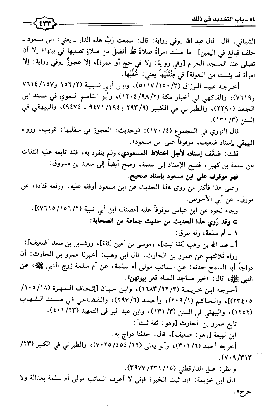 أ - عبد الله بن وهب [ثقة ثبت]، وموسى بن أعين [ثقة]، ورشدين بن سعد [ضعيف]: رواه ثلاثتهم عن عمرو بن الحارث، قال ابن وهب: أخبرنا عمرو بن الحارث: أن دراجًا أبا السمح حدثه: عن السائب مولى أم سلمة، عن أم سلمة زوج النبي - صلى الله عليه وسلم -، عن النبي - صلى الله عليه وسلم -، قال: "خير مساجد النساء قعر بيوتهن".