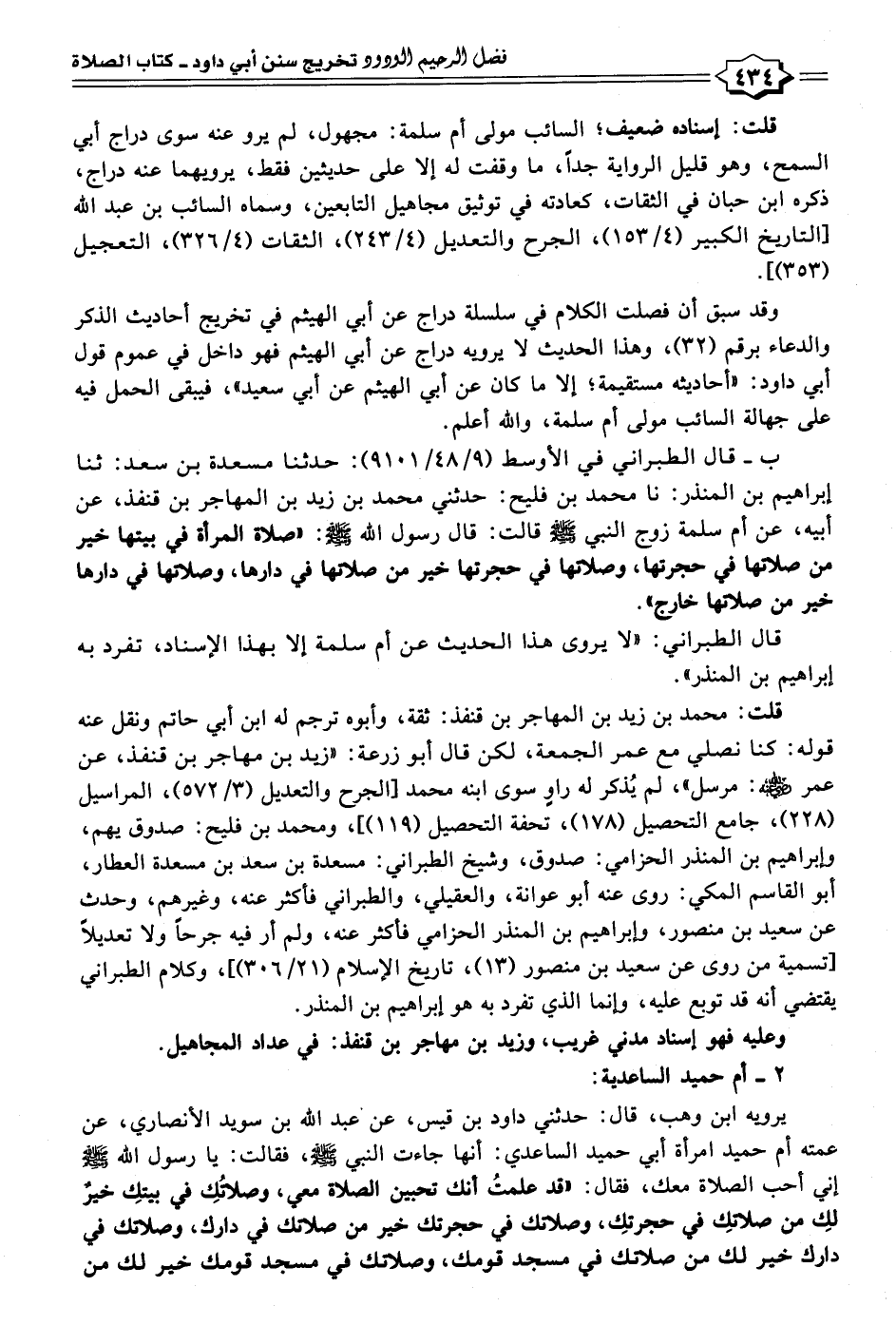 ب - قال الطبراني في الأوسط (٩/ ٤٨/ ٩١٠١): حدثنا مسعدة بن سعد: ثنا إبراهيم بن المنذر: نا محمد بن فليح: حدثني محمد بن زيد بن المهاجر بن قنفذ، عن أبيه، عن أم سلمة زوج النبي - صلى الله عليه وسلم - قالت: قال رسول الله - صلى الله عليه وسلم -: "صلاة المرأة في بيتها خير من صلاتها في حجرتها، وصلاتها في حجرتها خير من صلاتها في دارها، وصلاتها في دارها خير من صلاتها خارج".