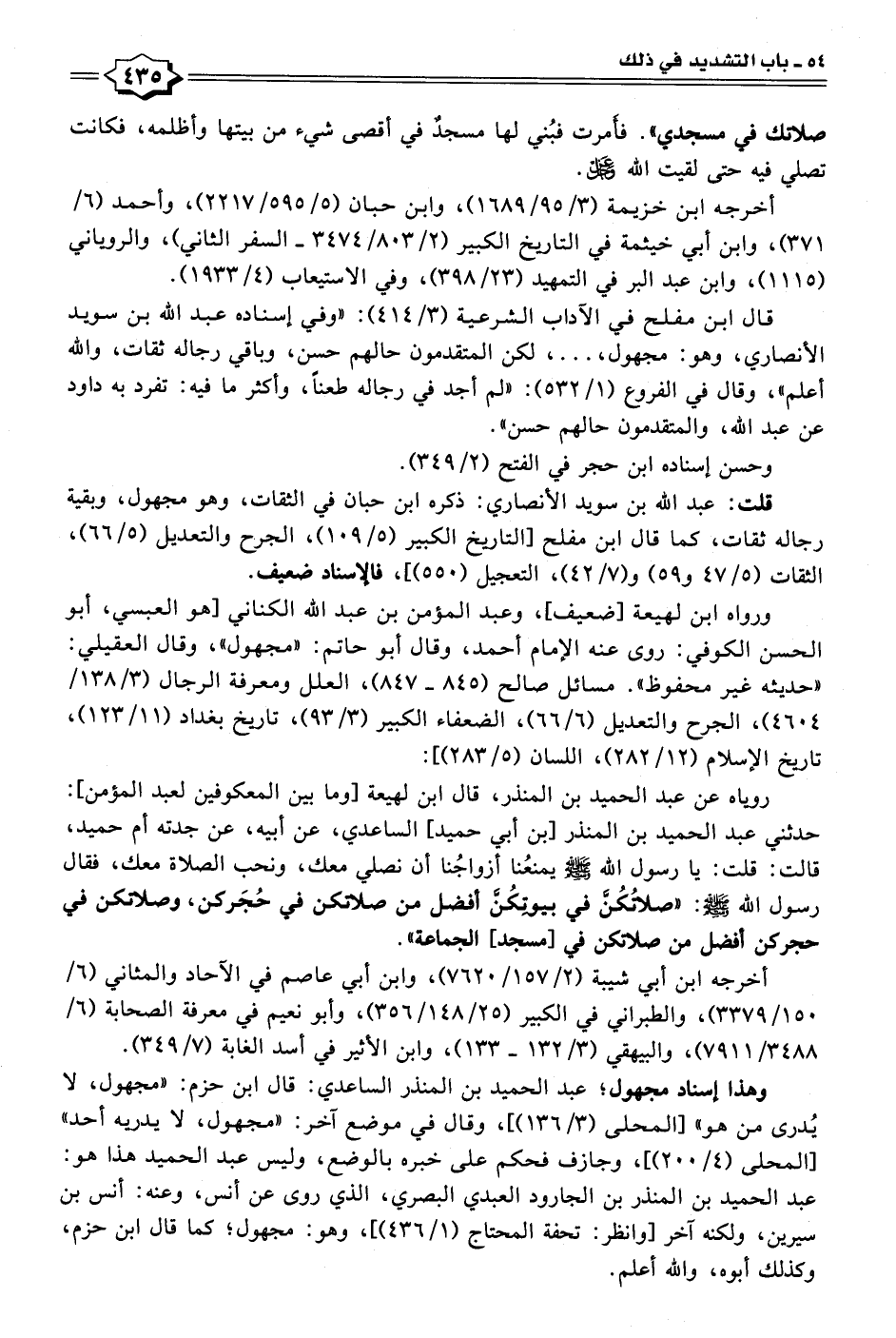 صلاتك في مسجدي". فأمرت فبُني لها مسجدٌ في أقصى شيء من بيتها وأظلمه، فكانت تصلي فيه حتى لقيت الله عزَّ وجلَّ.