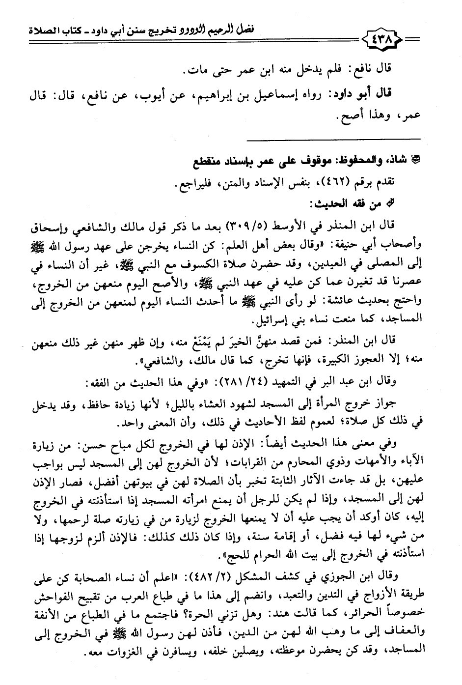 قال ابن المنذر في الأوسط (٥/ ٣٠٩) بعد ما ذكر قول مالك والشافعي وإسحاق وأصحاب أبي حنيفة: "وقال بعض أهل العلم: كن النساء يخرجن على عهد رسول الله - صلى الله عليه وسلم - إلى المصلى في العيدين، وقد حضرن صلاة الكسوف مع النبي - صلى الله عليه وسلم -، غير أن النساء في عصرنا قد تغيرن عما كن عليه في عهد النبي - صلى الله عليه وسلم -، والأصح اليوم منعهن من الخروج، واحتج بحديث عائشة: لو رأى النبي - صلى الله عليه وسلم - ما أحدث النساء اليوم لمنعهن من الخروج إلى المساجد، كما منعت نساء بني إسرائيل.