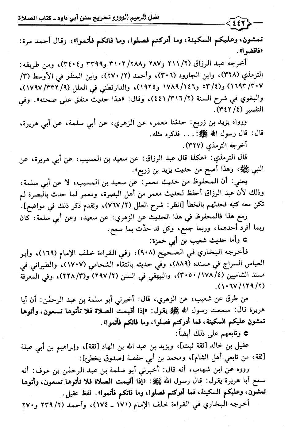 تمشون، وعليكم السكينة، وما أدركتم فصلوا، وما فاتكم فأتموا"، وقال أحمد مرة: "فاقضوا".