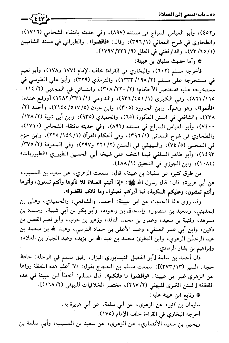 من طرق كثيرة عن سفيان بن عيينة، قال: سمعت الزهري، عن سعيد بن المسيب، عن أبي هريرة، قال: قال رسول الله - صلى الله عليه وسلم -: "إذا أتيتم الصلاة فلا تأتوها وأنتم تسعون، وأتوها وأنتم تمشون، وعليكم السكينة، فما أدركتم فصلوا، وما فاتكم فاقضوا".