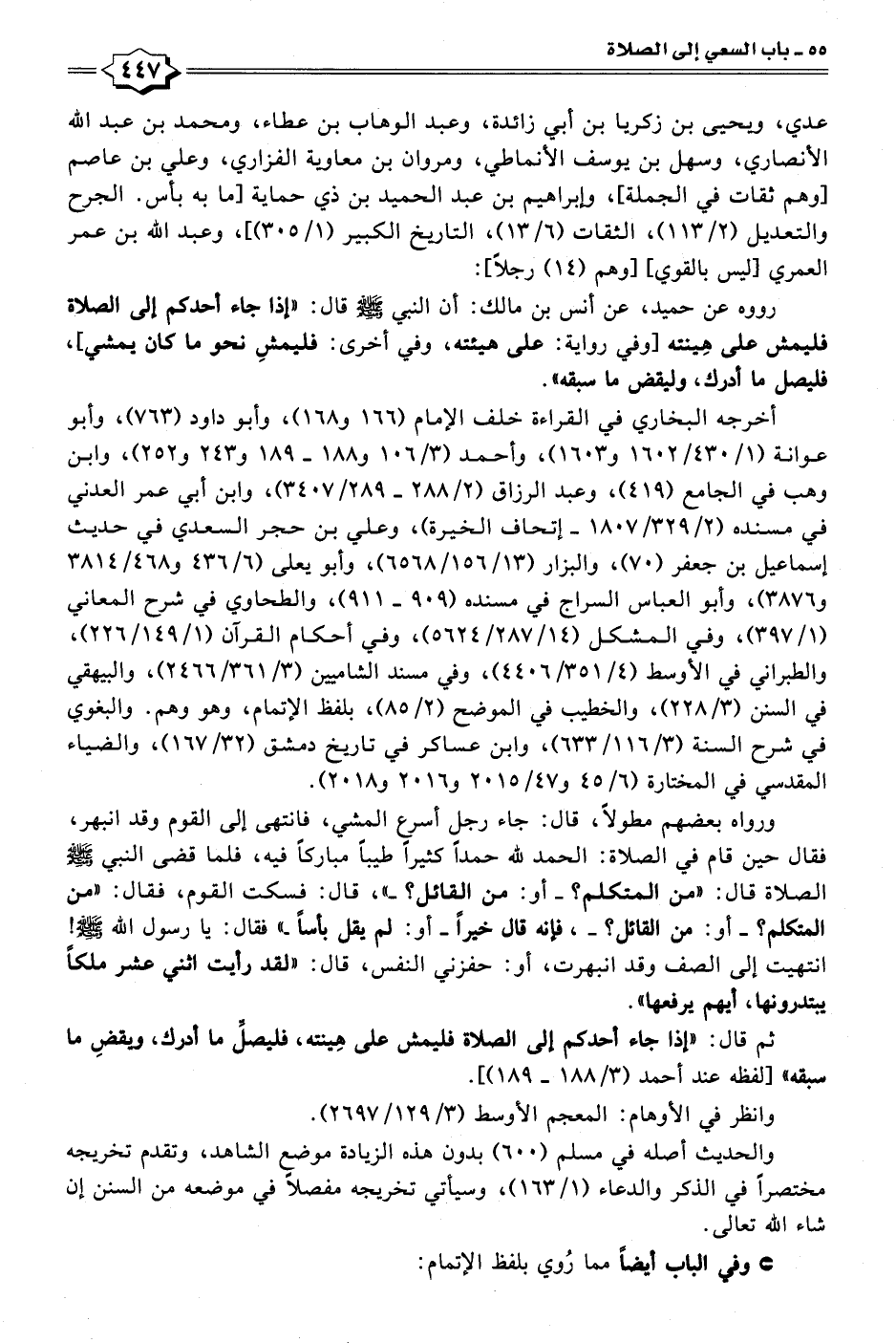 رووه عن حميد، عن أنس بن مالك: أن النبي - صلى الله عليه وسلم - قال: "إذا جاء أحدكم إلى الصلاة فليمش على هِينته [وفي رواية: على هيئته، وفي أخرى: فليمشِ نحو ما كان يمشي]، فليصل ما أدرك، وليقض ما سبقه".