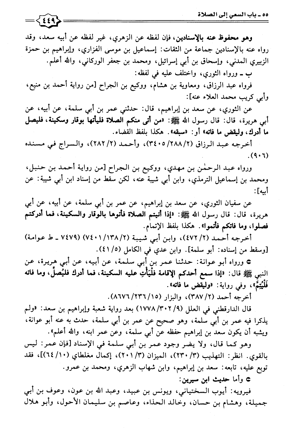 عن سفيان الثوري، عن سعد بن إبراهيم، عن عمر بن أبي سلمة، عن أبيه، عن أبي هريرة، قال: قال رسول الله - صلى الله عليه وسلم -: "إذا أتيتم الصلاة فأتوها بالوقار والسكينة، فما أدركتم فصلوا، وما فاتكم فأتموا". هكذا بلفظ الإتمام.