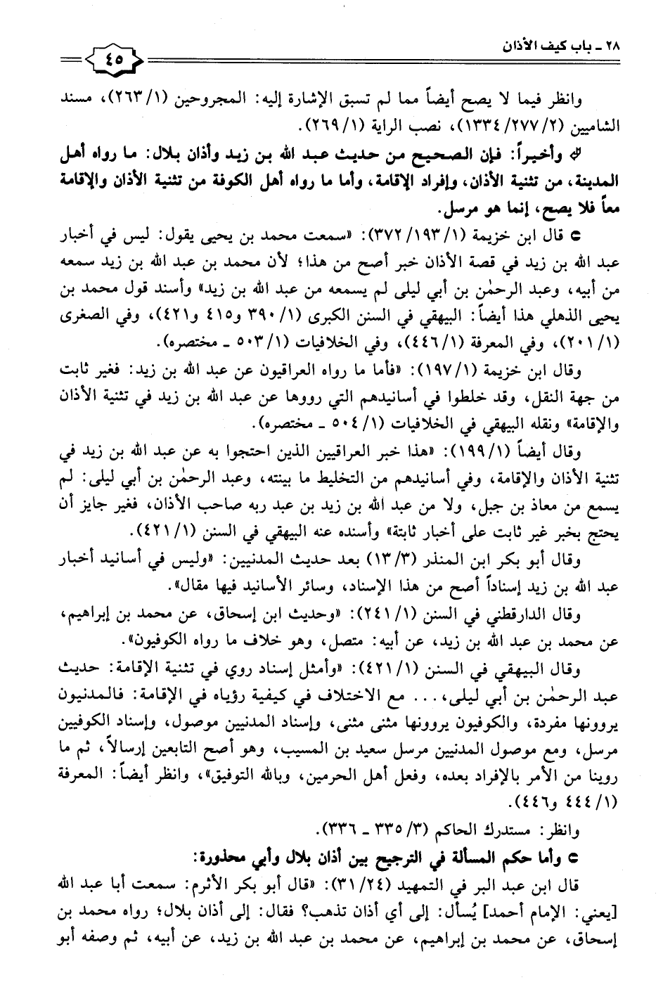 • وأخيرًا: فإن الصحيح من حديث عبد الله بن زيد وأذان بلال: ما رواه أهل المدينة، من تثنية الأذان، وإفراد الإقامة، وأما ما رواه أهل الكوفة من تثنية الأذان والإقامة معًا فلا يصح، إنما هو مرسل.