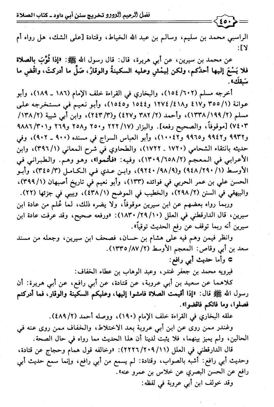 الراسبي محمد بن سليم، وسالم بن عبد الله الخياط، وقتادة [على الشك، هل رواه أم لا]: عن محمد بن سيرين، عن أبي هريرة، قال: قال رسول الله - صلى الله عليه وسلم -: "إذا ثُوِّبَ بالصلاة فلا يَسْعَ إليها أحدُكم، ولكن لِيمْشِ وعليه السكينةُ والوقارُ، صَلِّ ما أدركتَ، واقْضِ ما سَبقكَ".